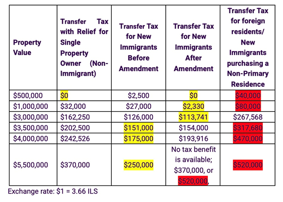 Practical Example of the Changes: Below is a table comparing the actual transfer tax that would be imposed on new immigrants purchasing properties of varying values, before and after the amendments to the regulations, as well as a comparison to the tax brackets applicable to non-immigrants: