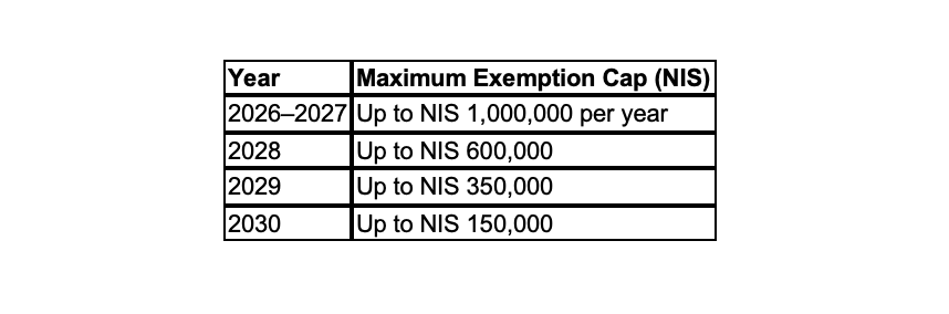 - Pro rata application for 2026: In 2026, the exemption cap will be applied on a pro rata basis according to the individual’s period of Israeli residency during that year.