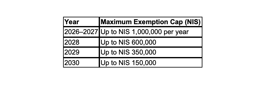 • Pro rata application for 2026: In 2026, the exemption cap will be applied on a pro rata basis according to the individual’s period of Israeli residency during that year.